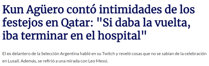 178直播01月04日讯 据阿根廷媒体Tyc报道,阿圭罗在近期直播时谈到了关于阿根廷夺得世界杯冠军后的一些有趣的事情。