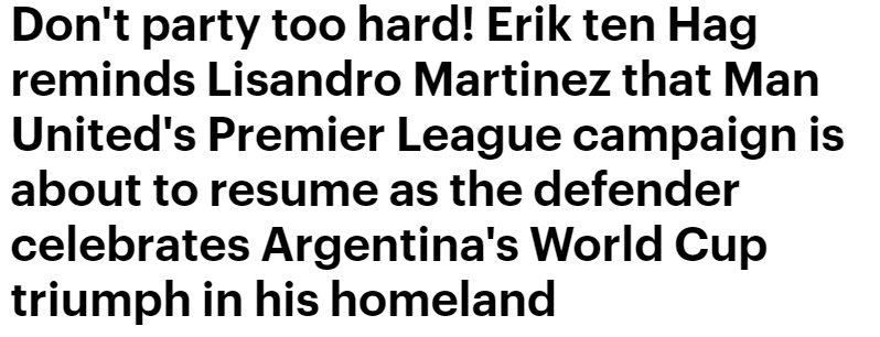 曼联主帅滕哈格在接受采访时说:“我能理解利桑德罗一直在庆祝,他赢得了最高的荣誉。但同时他也要注意,因为英超联赛在27日就要开始了。”
