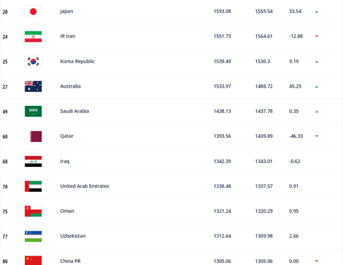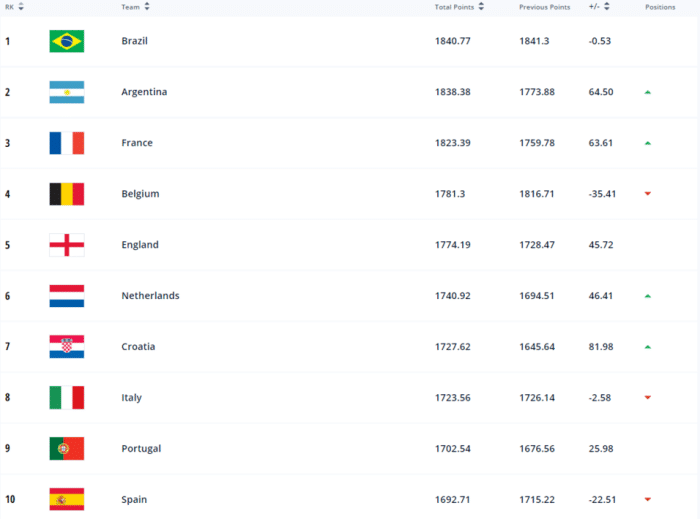 178直播12月22日讯 ,国际足联官方公布2022年国家队最终排名,巴西队依然排在榜首,新科世界杯冠军阿根廷排在第2,中国队排名下降一位,位居第80名。