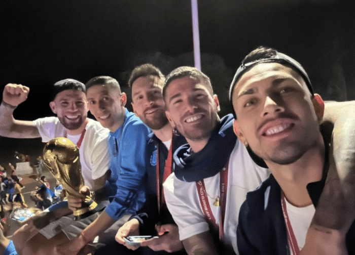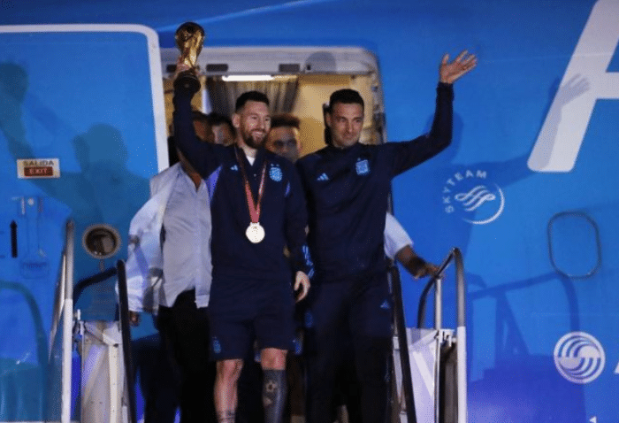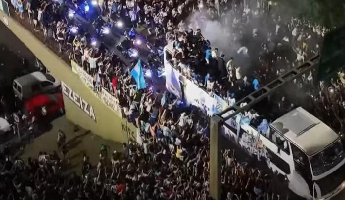 球队夺冠,整个阿根廷疯狂庆祝,阿根廷政府宣布于当地时间20日全国放假一天,庆祝阿根廷队赢得卡塔尔世界杯冠军。球队的飞机还没有到布宜诺斯艾利斯的埃塞萨国际机场,上万的球迷已经早早的等候了,机场附近道路已经全部塞满了人,梅西高举大力神杯走下飞机,随后所有球员登上游行大巴,一路高歌展示大力神杯,享受属于自己的荣耀。
