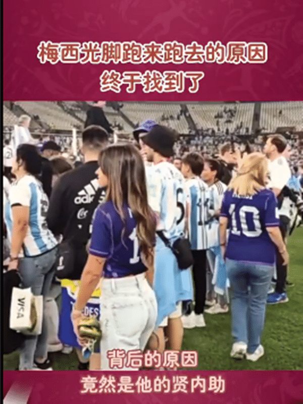 梅西为何会光着脚庆祝呢?梅西的鞋子去哪里了呢?答案也很简单,通过慢镜头,我们可以发现,在比赛结束后,梅西的妻子安东内拉第一时间找到了梅西送给了丈夫拥抱,随后安东内拉把梅西那双金灿灿的球鞋拿走了,在梅西环场庆祝的时候,安妞也是一直拿着梅西的这双球鞋,而可怜的梅西也是光着脚在场地上行走,继续自己的庆祝之旅。