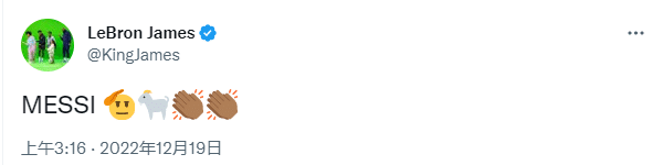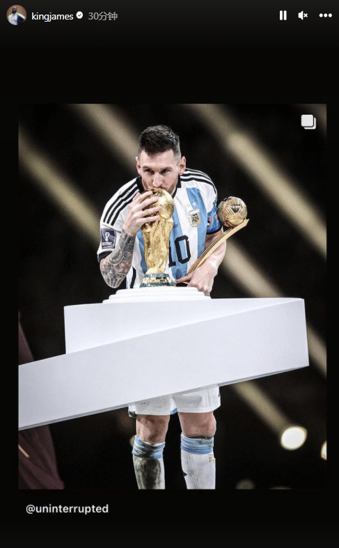 詹姆斯晒出梅西亲吻大力神杯的夺冠照,还发推写道:恭喜梅西,历史最佳(GOAT);值得一提的是,詹姆斯自己家中全程观看本届世界杯决赛。