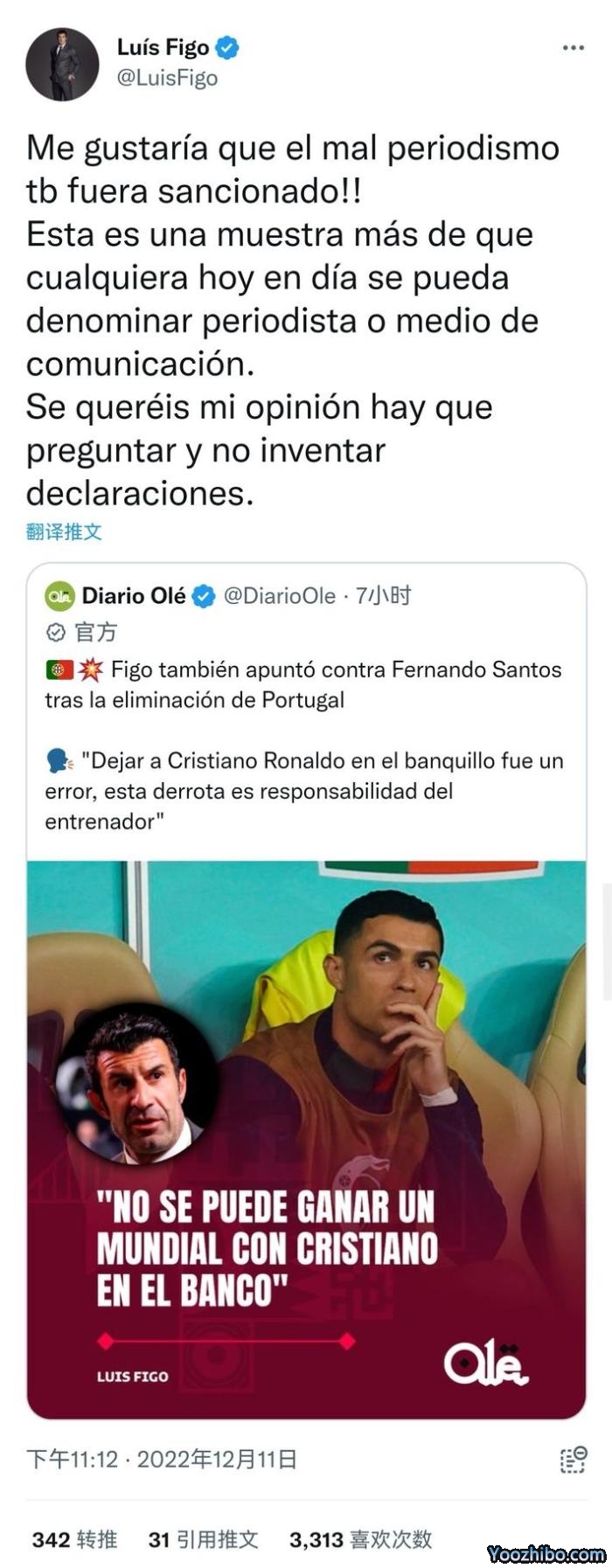 178直播12月13日阿根廷媒体《奥莱报》发文表示:菲戈在葡萄牙被淘汰后也盯上了费尔南多-桑托斯,“让克里斯蒂亚诺-罗纳尔多坐在替补席上是个错误,这场失利是主教练的责任。”