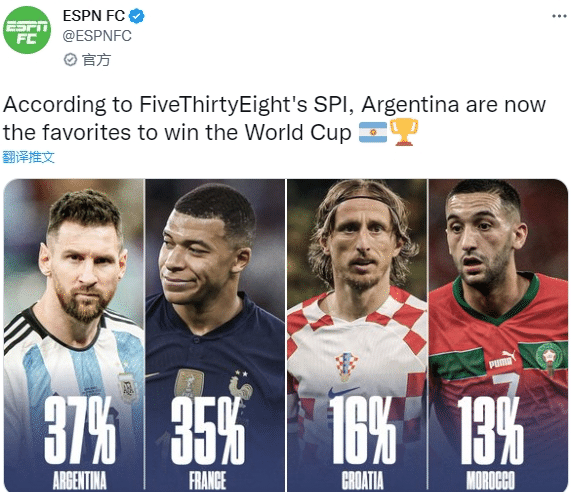 能够晋级四强,对于梅西来说只是完成了一个小目标,而接下来阿根廷队的终结目标是冲击世界杯冠军,他们的对手是上届亚军克罗地亚,另一个半区则是卫冕冠军法国队迎战最大黑马摩洛哥。根据著名数据网站预测,梅西率领的阿根廷夺冠概率是最高的,高达37%,法国队表现强势,但没有本泽马、博格巴和坎特的他们夺冠概率为35%,克罗地亚16%,摩洛哥13%;在接下来的半决赛中,阿根廷晋级的概率为64,法国为66%。很显然,数据预测更加看好阿根廷队和法国队会师最后的冠军决战。