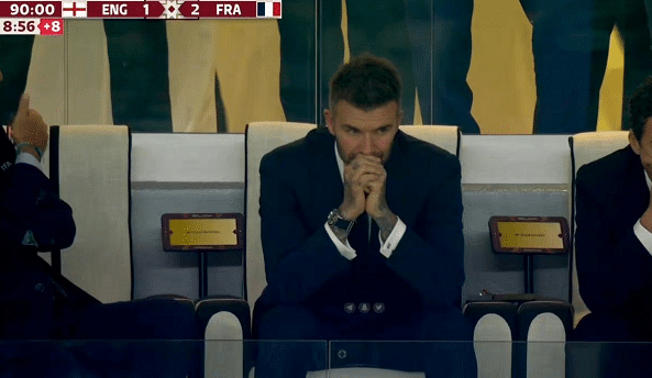 这场比赛进行到最后时刻,英格兰队依旧1-2落后,镜头给到场边的贝克汉姆,他面露紧张,随后开始祈祷。英格兰队获得了禁区前沿任意球的机会,此前拉什福德曾经在相似的位置任意球直接破门,如今最后的机会,可惜他踢高了。再加上凯恩的踢丢点球,以及看台上的英格兰足球名宿贝克汉姆,不仅令人想到难道这就是历史的轮回。