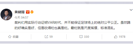 包括黄健翔也在社交媒体上怒斥裁判,称:“裁判们用实际行动证明VAR时代,并不能保证足球场上的绝对公平公正。虽然踢的好确实是好,但是吹得烂也真是烂。最烂就是尺度摇摆,标准混乱。”