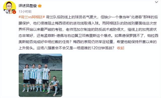 而另外一场比赛则更加令人关注,荷兰和阿根廷这对老冤家,在2014年巴西世界杯半决赛之后,再度相遇。詹俊在本场比赛之前,谈及了本场对决。詹俊认为本场荷兰的后腰位置缺乏硬度,很难阻止阿根廷进球。但荷兰人的防守反击,则是他们的法宝。另外,梅西的发挥举足轻重。詹俊预测,这可能是一场120分钟的大战!