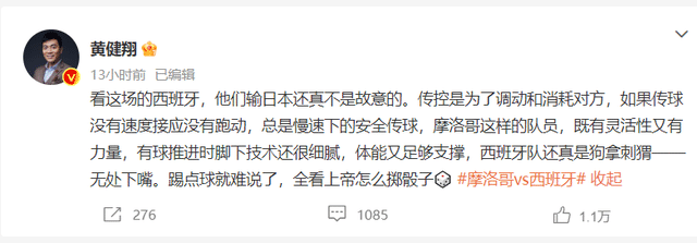 黄健翔写道:“看这场的西班牙,他们输日本还真不是故意的。传控是为了调动和消耗对方,如果传球没有速度接应没有跑动......西班牙队还真是狗拿刺猬——无处下嘴。”显然,黄健翔认为西班牙的传控打法空有其形,而无其神。这场比赛,西班牙拥有77%的控球率,但体现在最终的效果上,却一文不值。