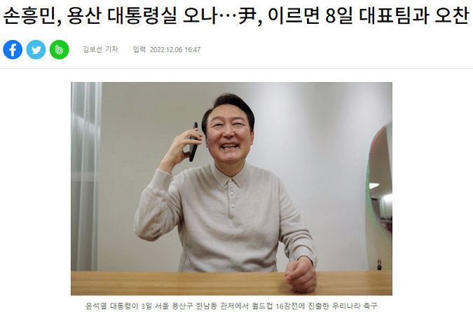 韩国队无缘世界杯八强之后,本届赛事的征途彻底落下帷幕,接下来就要回国。根据韩媒《inews24》的报道显示,韩国总统尹锡悦将与韩国队共进午宴,时间是12月8日:“在世界杯上全力以赴的韩国队球员和教练们,回国后将得到来自总统的鼓励,总统希望最早可以在8日与球队共进午宴。很多人都熬夜看比赛了,16强赛是韩国全体国民一起参与的比赛,大家不会忘记球队12月份在卡塔尔带来的礼物。尹总统也向球队发去了贺信,他表示韩国足球没有不可逾越的障碍,我们将会继续挑战。”