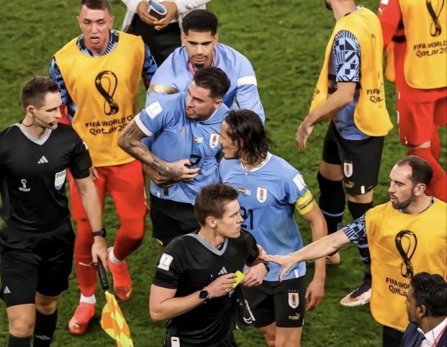 赛后,怒不可遏的乌拉圭球员纷纷围堵主裁希伯特讨要说法。卡瓦尼更是因此吃到黄牌,而中卫希门尼斯,更是情绪激动推了主裁,甚至还爆了粗口。