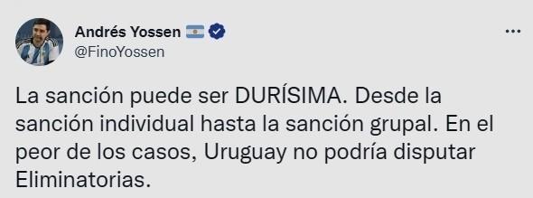 据记者Andrés Yossen透露,乌拉圭可能遭到FIFA严重的处罚,包括个人处罚和团队处罚,最严重的处罚将是禁止参加下届世界杯预选赛。如果乌拉圭真的被禁赛,那么他们将提前年无缘下一届由美国、加拿大、墨西哥共同承办的世界杯。这对于刚从本届世界杯出局的乌拉圭来说,无疑是更加沉重的打击。