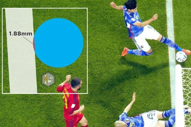 日本和西班牙比赛的第二球,也就是第50分钟三苫薰底线处将球回做到门前,田中碧抢射空门得手的进球,一度引发巨大争议。但裁判通过VAR的精确观察,最终判定三苫薰底线回捞的传球,没有整体出底线,进球有效。事实上,从转播画面和肉眼来看,这都是一个出界球,但高科技让日本没有受到冤枉。