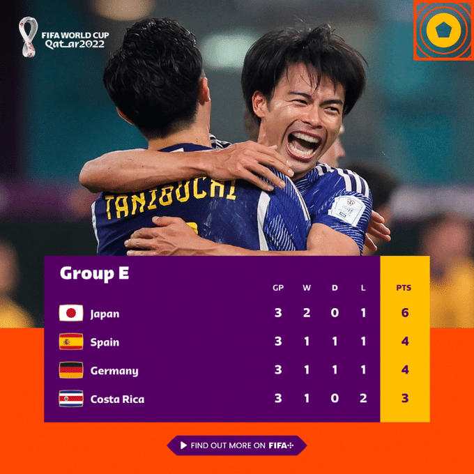 E组方面,日本2-1击败西班牙,从死亡小组中头名出线,西班牙排名第二,德国尽管4-2大胜哥斯达黎加,但因净胜球劣势仍然出局。