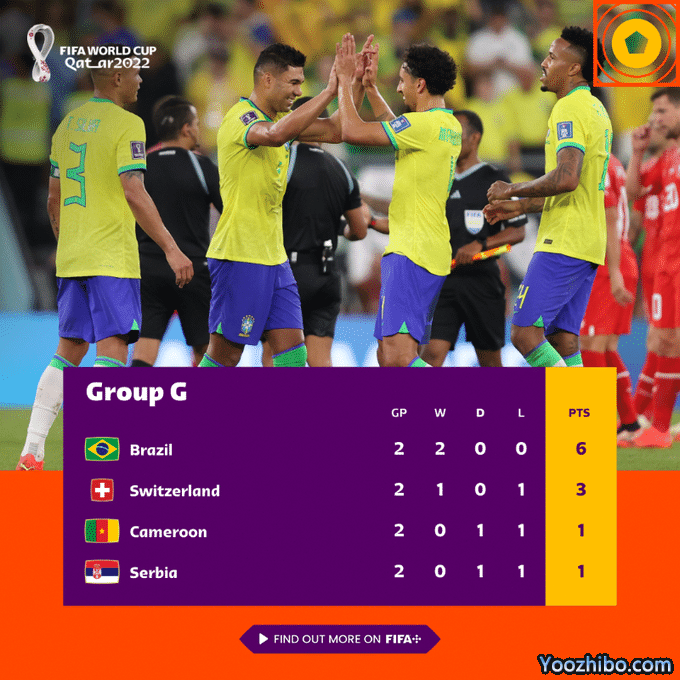 G组方面,喀麦隆3-3战平塞尔维亚,巴西1-0小胜瑞士,巴西6分提前一轮晋级,瑞士3分第二,喀麦隆和塞尔维亚均为1分。末轮,巴西将迎战喀麦隆,瑞士迎战塞尔维亚。