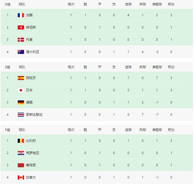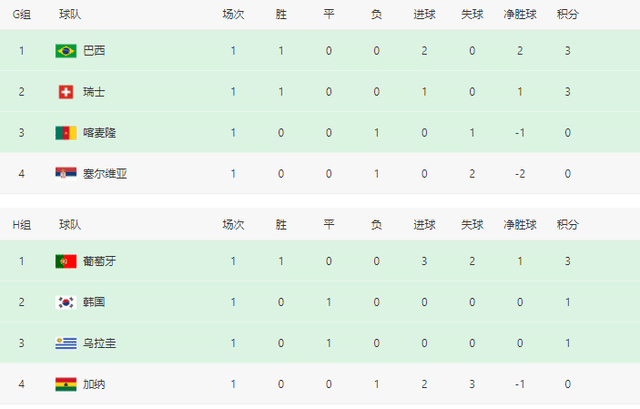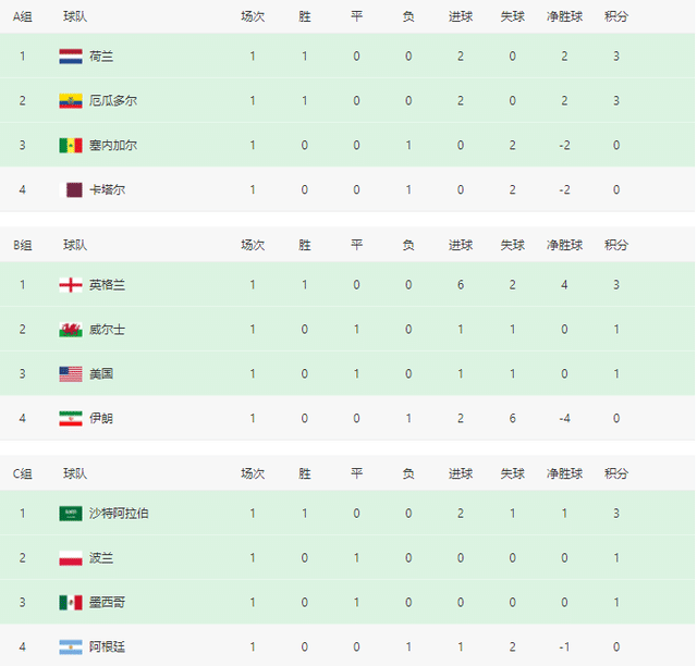 在首轮积分榜方面,欧洲球队可谓大获全胜,占据了6个小组的小组第一。荷兰A组第一,英格兰B组第一,法国D组第一,西班牙E组第一,比利时F组第一,葡萄牙H组第一。另外,沙特C组第一,巴西G组第一。此外,威尔士和瑞士也都拿到胜利,只是因为净胜球暂列第二位。