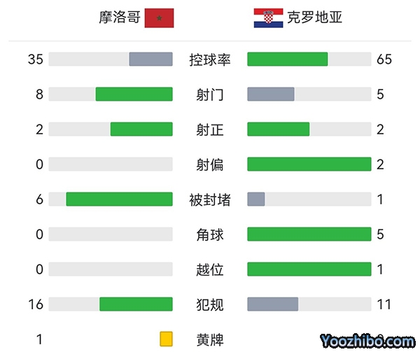 全场比赛结束,摩洛哥0-0克罗地亚。