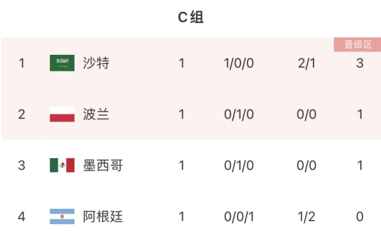 在莱万踢丢点球之后,波兰和墨西哥队战成了平局,这样C组的排名更新,小组赛首轮战罢,沙特队以3分优势领跑,他们以2-1爆冷逆转击败阿根廷队,排名第一。波兰排名第二,是因为黄牌数更少。墨西哥队第三名,阿根廷队0分排名垫底,但梅西所在的阿根廷队重新看到希望。