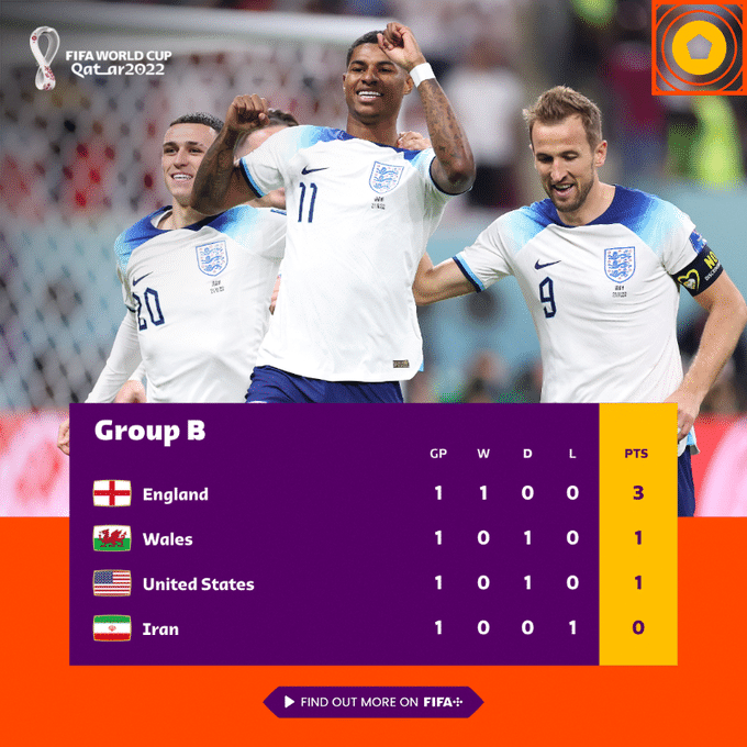 B组英格兰6-2血洗伊朗,威尔士1-1逼平美国,三狮军团3分领跑,红龙军团与星条旗军团1分,伊朗0分垫底。