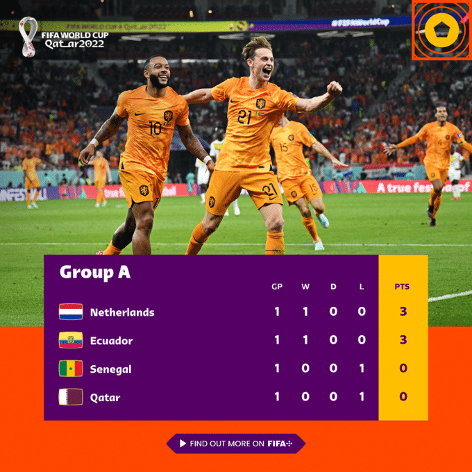 A组方面,东道主卡塔尔揭幕战0-2输给厄瓜多尔,荷兰今天凌晨2-0击败塞内加尔,荷兰与厄瓜多尔并列第一,塞内加尔与卡塔尔0分。