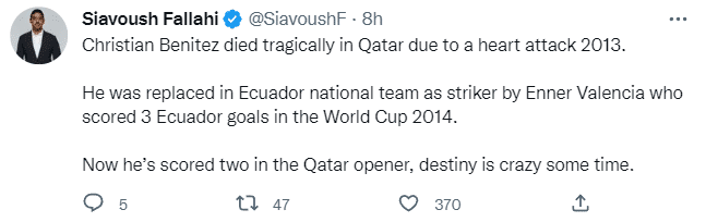 记者SiavoushFallahi表示:“2013年,克里斯蒂安-贝尼特斯因突发心脏病医治无效,在卡塔尔去世。他在厄瓜多尔国家队的位置被恩纳-瓦伦西亚取代,后者在2014年的巴西世界杯上为厄瓜多尔队打进3球。”