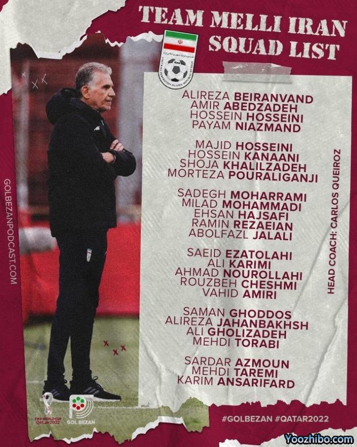 门将:阿里雷扎-贝兰万德(30岁/波斯波利斯)、侯赛因-侯赛尼(30岁/埃斯特拉尔)、帕亚姆-尼亚曼德(27岁/塞帕汉)、阿米尔-阿贝德扎德(29岁/庞费拉迪纳)