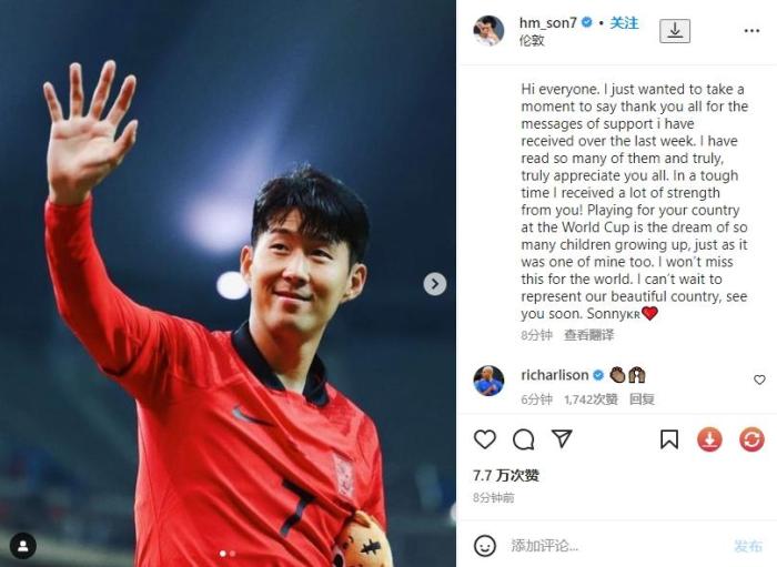 孙兴慜写道:“大家好,非常感谢大家过去一周给我的支持与鼓励的信息,在读的过程中我得到了很大力量。在世界杯为我们的国家效力,是许多孩子成长为球员的梦想。直到今天,我的这一梦想也没有改变。”