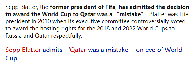 近日接受瑞士媒体采访时,布拉特承认让卡塔尔举办世界杯是个错误,他对此负责,本届世界杯本来应该在美国举办。