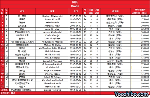 178直播讯 阿曼男足成立于1978年,于2004年第一次打进亚洲杯决赛圈,曾两度夺得海湾杯足球赛冠军。那么阿曼队征战此次世预赛的阵容是怎么样的呢,接下来就随小编一起来了解一下吧。