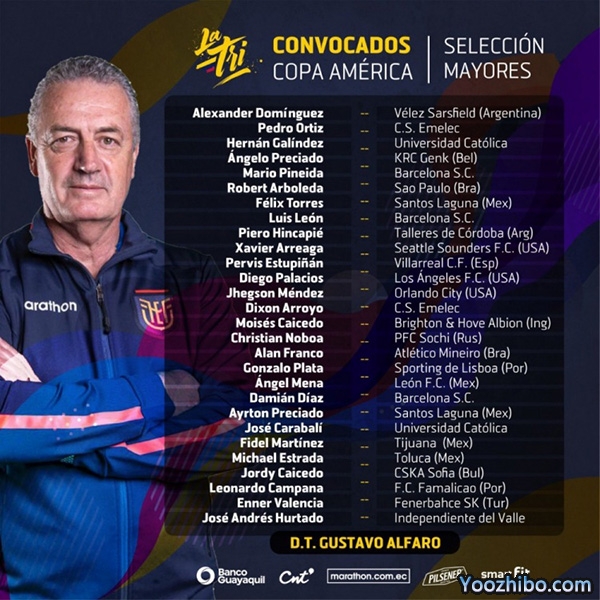 后卫:安吉洛-普雷西亚多(亨克,比利时)、马里奥-佩内达(巴塞罗那SC)、罗伯特-阿尔博莱达(圣保罗,巴西)、菲利克斯-托雷斯(桑托斯拉古纳,墨西哥)、路易斯-莱昂(巴塞罗那SC)、皮埃罗-辛卡佩(塔勒瑞斯,阿根廷)、哈维尔-阿雷加(西雅图海湾,美国)、埃斯图皮尼安(比利亚雷亚尔,西班牙)、迭戈-帕拉西奥斯(洛杉磯FC,美国)、