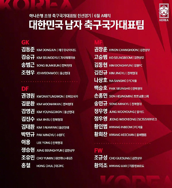 门将:金东俊、金承奎、宋范根、赵贤祐。