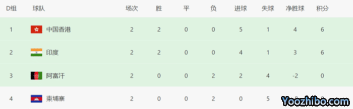 2022年,中国香港再次带来惊喜,他在亚洲杯预选赛踢出了强劲的状态,取得小组赛2连胜,以6分登上了小组积分榜第一名。本届亚洲杯预选赛,中国香港与印度、阿富汗、柬埔寨分到D组,按照赛事规则,小组第一名直接晋级亚洲杯,第二名待定,第三名和第四名出局。