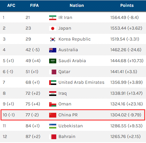 国足0-2惨败之后带来了连锁反应,首先是世界排名层面,国足将会从第75名下降到第77名,这一期国足积分丢了9.79分,来到1304.02分。