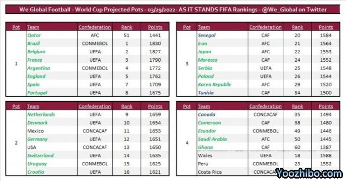 第二档球队构成则为荷兰、丹麦、德国、瑞士、乌拉圭和克罗地亚,伊朗、日本、摩洛哥、塞尔维亚、波兰、韩国确定第三档,喀麦隆、厄瓜多尔、沙特、加纳第四档。