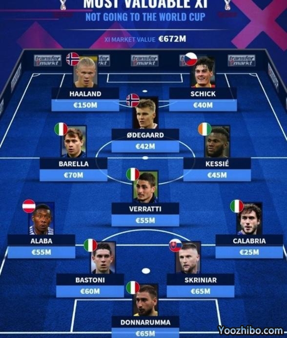 178直播03月27日讯 本轮世界杯预选赛结束了新一轮的争夺,有欢喜也有悲情,德国足球转会市场也盘点了目前已经确定无缘世界杯身价最高阵容,其中哈兰德领衔。