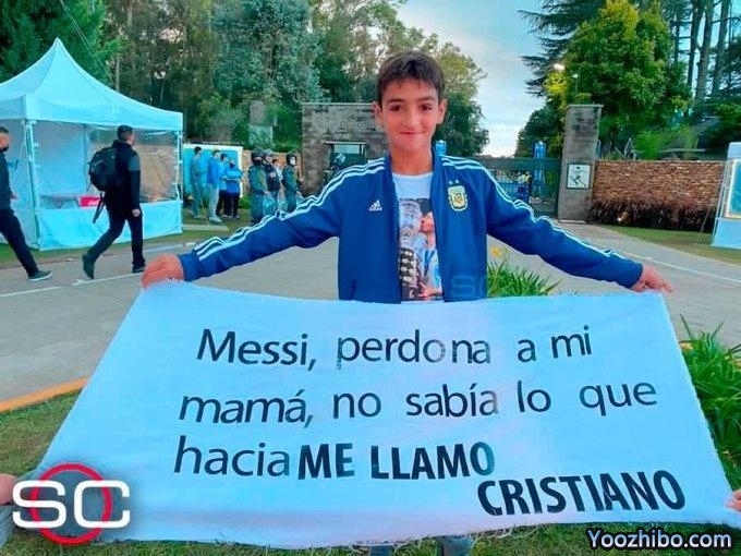 这名身穿阿根廷外套的小球迷展示了一个横幅,上面写道:“梅西请原谅我妈妈,她给我取名克里斯蒂亚诺。”