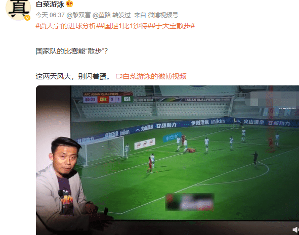 178直播03月27日讯 在国足1-1战平沙特的比赛中,于大宝在一次进攻中出现“散步”的情况,在球权转换之后,也没有第一时间回防,这让很多解说员和网友都比较不满。不过也有另外一种声音认为,于大宝不需要往前跑,他要做“保护性接应”。