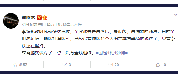 知名记者贺晓龙在点评国足战术的时候怒斥是低级懦弱,他直言:“李铁执教时我就多次说过,全线退守是最落后、最低级、最懦弱的踢法,目前全世界足坛,弱队打强队时,已经没有球队11个人缩在本方半场的踢法了,只有李铁还在坚持。”