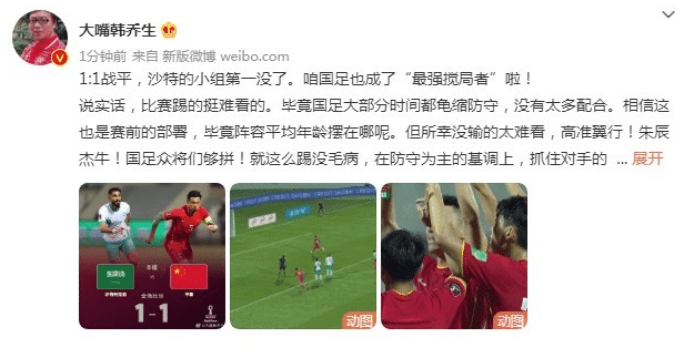 当然也有很多人持反对意见,比如前辈韩乔生老师,他就力挺李霄鹏的战术是不错的,就这么踢没毛病,称:“1:1战平,沙特的小组第一没了。咱国足也成了“最强搅局者”啦!说实话,比赛踢的挺难看的。毕竟国足大部分时间都龟缩防守,没有太多配合。相信这也是赛前的部署,毕竟阵容平均年龄摆在哪呢。但所幸没输的太难看,高准翼行!朱辰杰牛!国足众将们够拼!就这么踢没毛病,在防守为主的基调上,抓住对手的松懈,适当前压形成多人围攻,再短传渗透,必有奇效!”