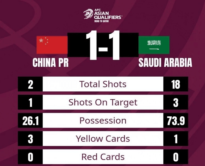 这场比赛国足的战术也引发争议,单看结果的话还是不错的,1-1战平榜首的沙特,将对手拉下马,被日本队反超。但从比赛过程来看,国足上半场0射门,只有28%的控球率,一直到第60分也没有射门,全场比赛下来,国足的射门数更是2-18远远落后于对手沙特,控球率26%-74%,几乎是被碾压,所以说各项数据全面落后,但中国队点球拿到了1分。