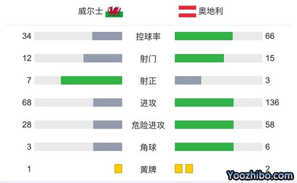 第25分钟,贝尔直接任意球直挂死角破门,威尔士1-0领先奥地利。