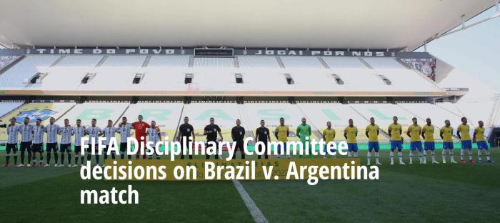 现在国际足联已经做出判决,比赛将择日重赛,巴西足协违反秩序与安全协议被罚款,阿根廷足协未能遵循秩序与安全、比赛准备和义务协议被罚款,上诉四名球员因违反防疫协议禁赛两场。