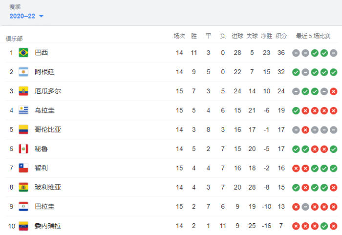 目前巴西14轮11胜3平保持不败,36分排名第一早已确定出线。阿根廷14轮32分排第二,厄瓜多尔15轮24分第三,乌拉圭15轮19分第四,哥伦比亚14轮17分第五,占据附加赛名额。
