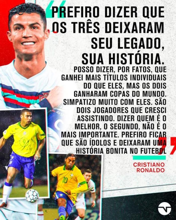 被问到谁是最好的罗纳尔多时,C罗回答道:“我不喜欢进行比较,我更喜欢的说法是三个罗纳尔多都留下了各自的财产,虽然我赢得的荣誉比其他两位多,但他们都有世界杯冠军。”