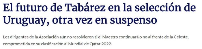 Tyc表示,在乌拉圭客场0-3不敌玻利维亚后,他们在南美区世预赛的排名已经下滑到第7位。乌拉圭足协在赛后召开了会议,探讨老帅塔瓦雷斯的未来,但是未能达成一致。