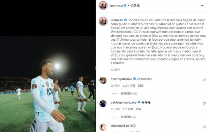 梅西写道:“我刚刚在巴黎降落,晋级世界杯决赛圈让我非常开心,感谢你们对我们的支持,一月份我们会再见。”