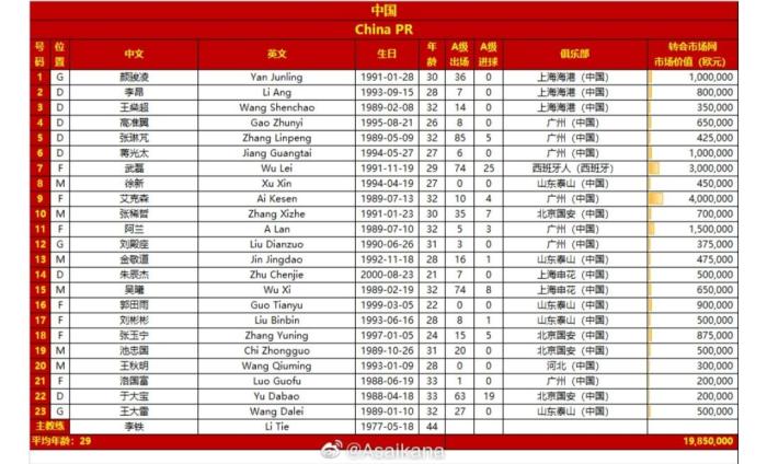 前锋:7-武磊、9-艾克森、11-阿兰、16-郭田雨、17-刘彬彬、18-张玉宁、21-洛国富