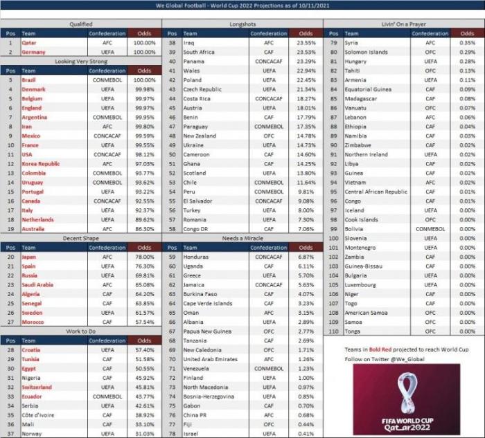 178直播10月12日讯 国外数据预测网站WeGlobalFootball分析了各队晋级世界杯决赛圈的最新概率,国足在击败越南后晋级概率稍稍提升。