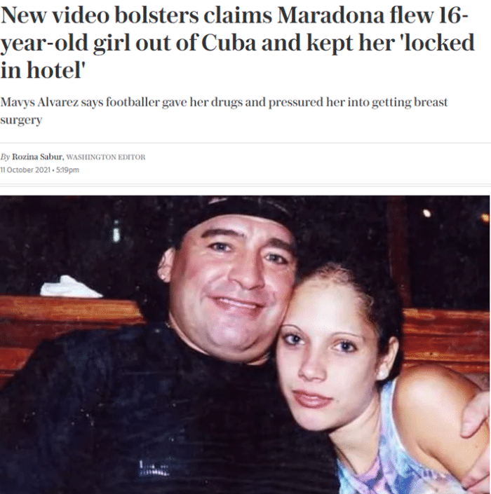 一段涉及马拉多纳的私密视频最近在一起人口贩卖案中曝光,视频中拍摄了马拉多纳与16岁少女在床上的画面,该少女名叫马维丝-阿尔瓦雷斯,她来自古巴,并声称自己在十几岁的时候被马拉多纳和他的助手带到阿根廷并软禁在一家酒店近三个月,这一切均未得到她父母的许可。