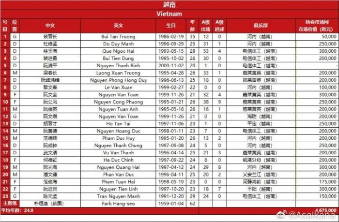 这份名单总身价467.5万欧元,由阮公凤、阮光海领衔,在赛前6小时,名单仍可变动。