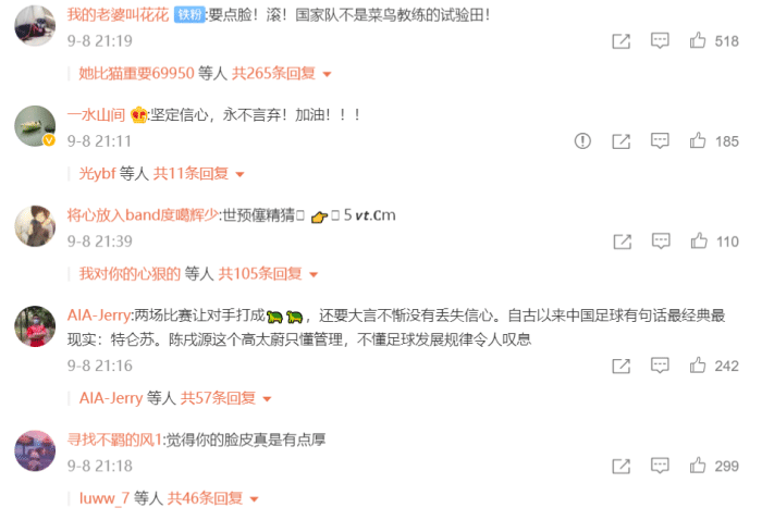 其实言论本身没有问题,只不过还是遭遇了球迷的狂轰乱炸,不少球迷在评论区恶语相向!有人说“要点脸!滚!国家队不是菜鸟教练的试验田!”也有人说“两场比赛让对手打成王八,还要大言不惭没有丢失信心。自古以来中国足球有句话最经典最现实:特仑苏。陈戌源这个高太蔚只懂管理,不懂足球发展规律令人叹息”